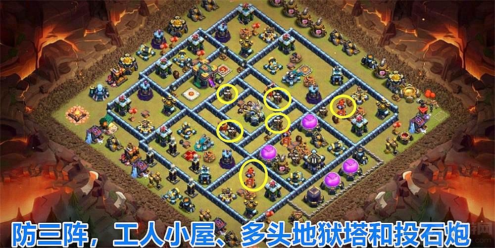 1.本次更新提高了,投石炮、地狱塔、天鹰火炮这些主防御建筑的等级,但是X弩的等级没有得到提升,所以很多大神玩家调整了X弩箭的站位,用X弩和箭塔作为消耗天女的第一道防线,其次14本的阵型亮点在工人小屋的身上,怎样才能利用工人小屋的机制成为了首先要考虑的难题之一。