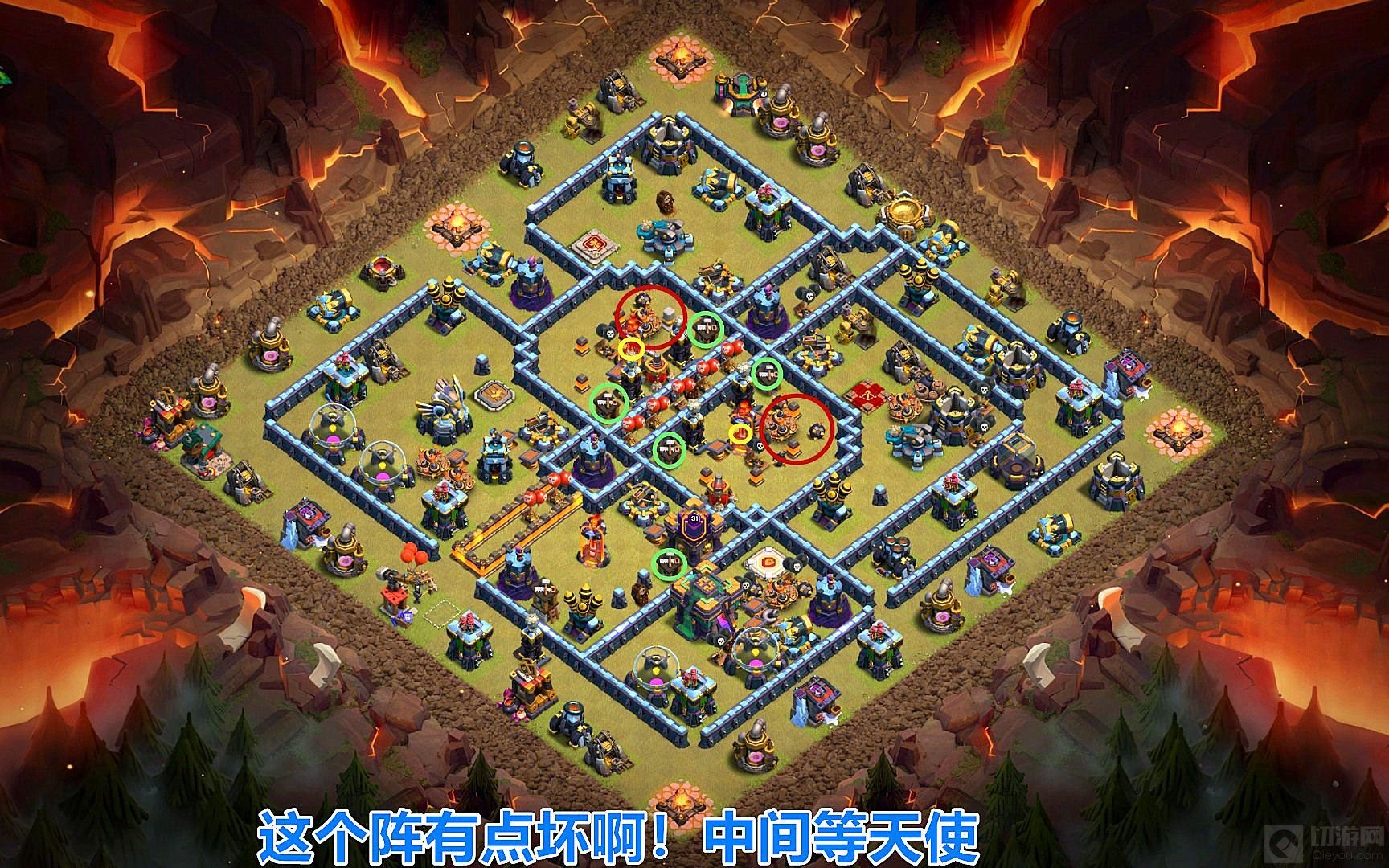 1.这个阵型也是现在比较多的“黑”天女的阵型,当天使和女王无忧无虑的进攻核心区域的时候,满天的“红雷”就会给她们上一课,有的玩家可能会说用气球引雷,但这是中间区域气球早在半路上就被消灭了,并且主防御建筑比较分散,所以想要三星拿下并不是一个简单是事情。