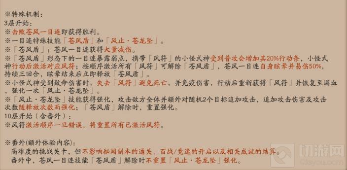 第三层开始苍风一目连拥有技能“苍风盾”和“风止·苍龙坠”。“苍风盾”使苍风一目连获得大量减伤,并使小怪获得“风符”,获得“风符”的小怪在受到普攻时会增加20%行动条,受到致命伤害时可避免死亡。每次行动后将激活对应风符,根据苍风一目连生命值下方的顺序,激活所有风符即可解除“苍风盾”,“风止·苍龙坠”技能获得强化,攻击敌方全体并追加一次伤害,追加伤害与追加数目随释放次数强化。“苍风盾”解除时将重置强化。第十层开始,风符激活顺序一旦错误,将重置所有已激活风符。