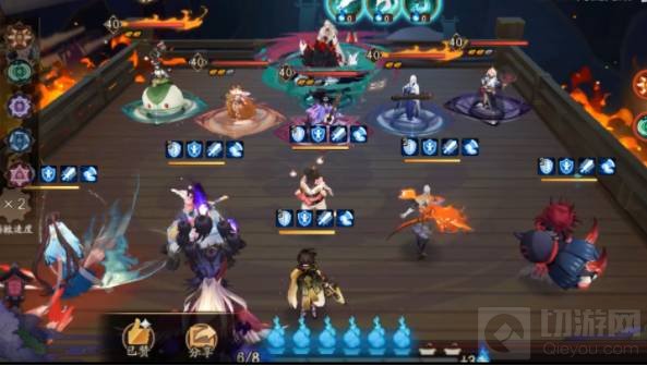 开局镜子挂镜佑,拉条,晴明开盾,第一个行动的单位普攻数珠把他拉到终点,第二个单位拉孟婆到终点,第三四个单位把数珠拉回怪物行动顺序第二位,第五个单位普攻星熊把他拉到妖琴前面,此时怪物顺序已经调整完毕,按照风符顺序的小松丸,数珠,星熊,妖琴,孟婆来行动并且点亮风符解除风盾,之后击杀boss即可通关。