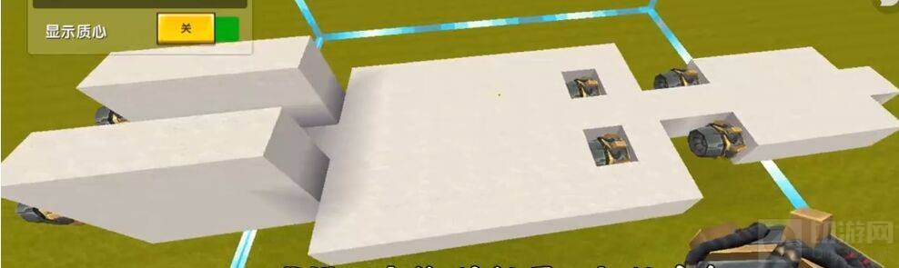 1.在机械车间的中间做出20格的长条,然后如下图所示,搭出飞机的底盘。
