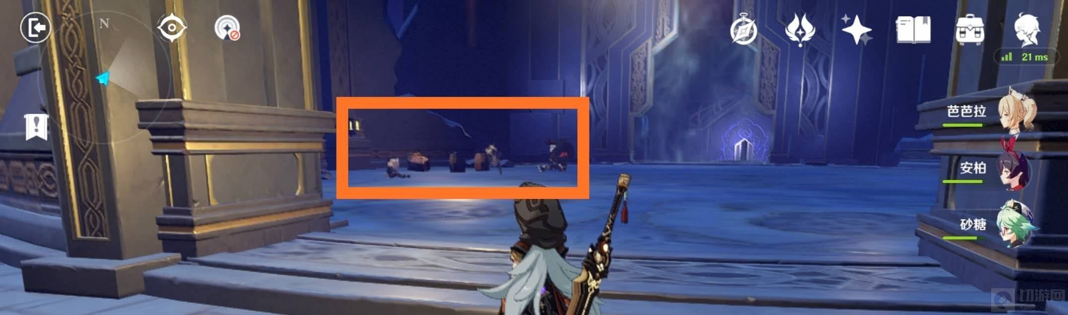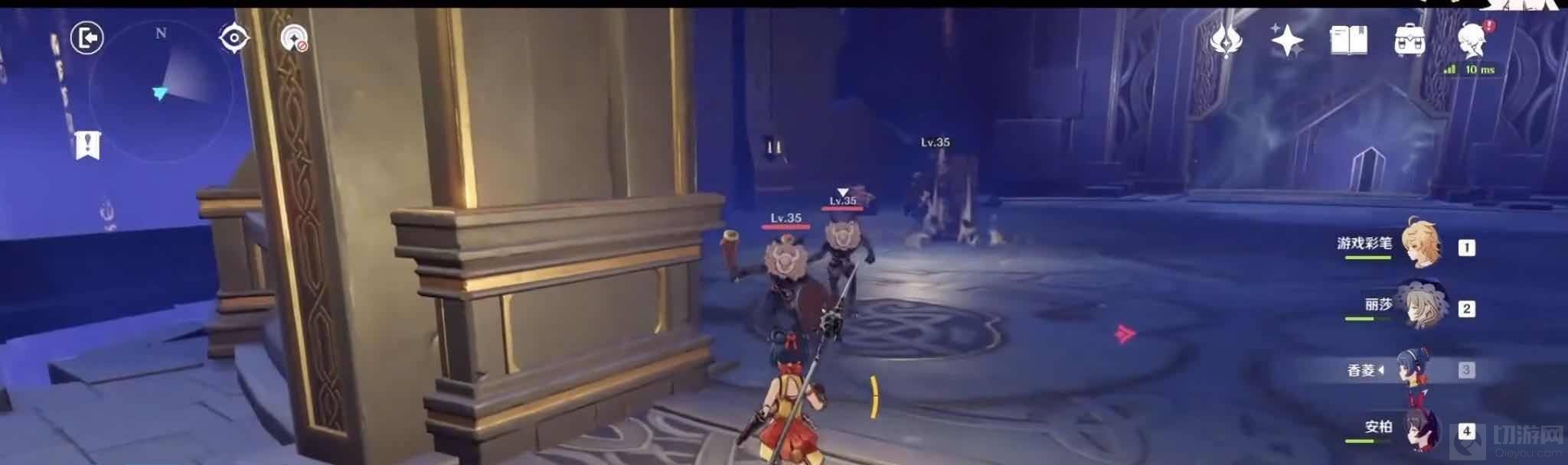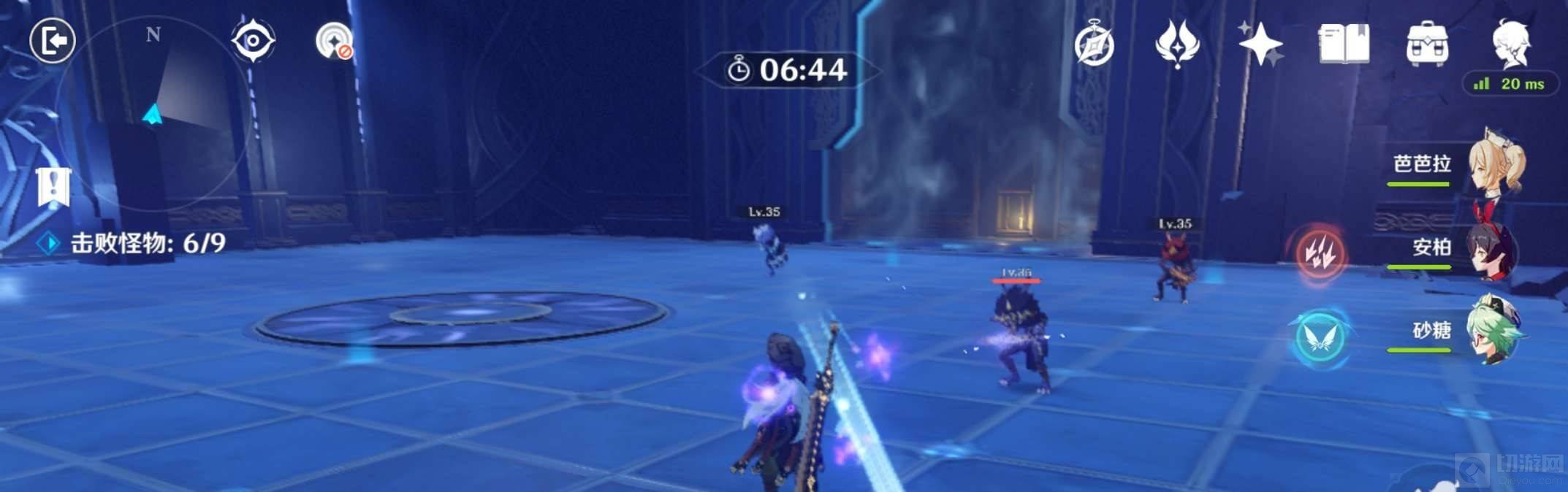 3. 操作技巧:先把两个小怪用风主推下去,然后当遗迹守卫和牛头人在一起的时候,用风主的大招聚怪,再切香菱大招,反正一顿操作,将它们推下去即可,操作不来就刮痧慢慢打。