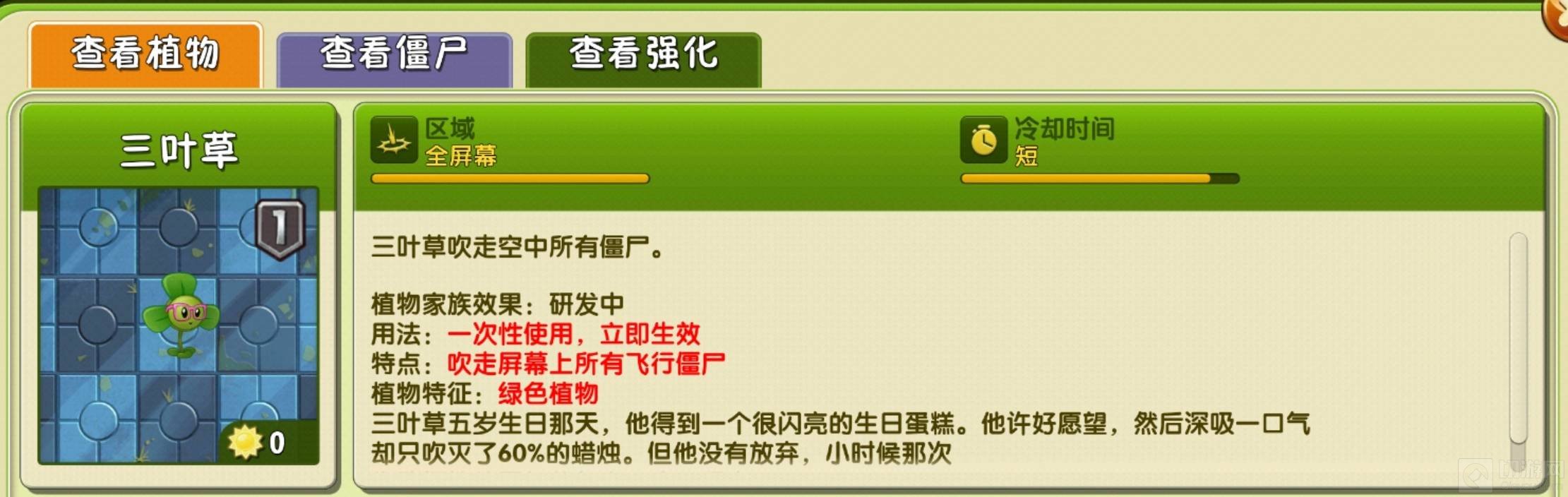 1、飞行僵尸可以种植三叶草,在全场刮起一阵风把飞行僵尸吹走。