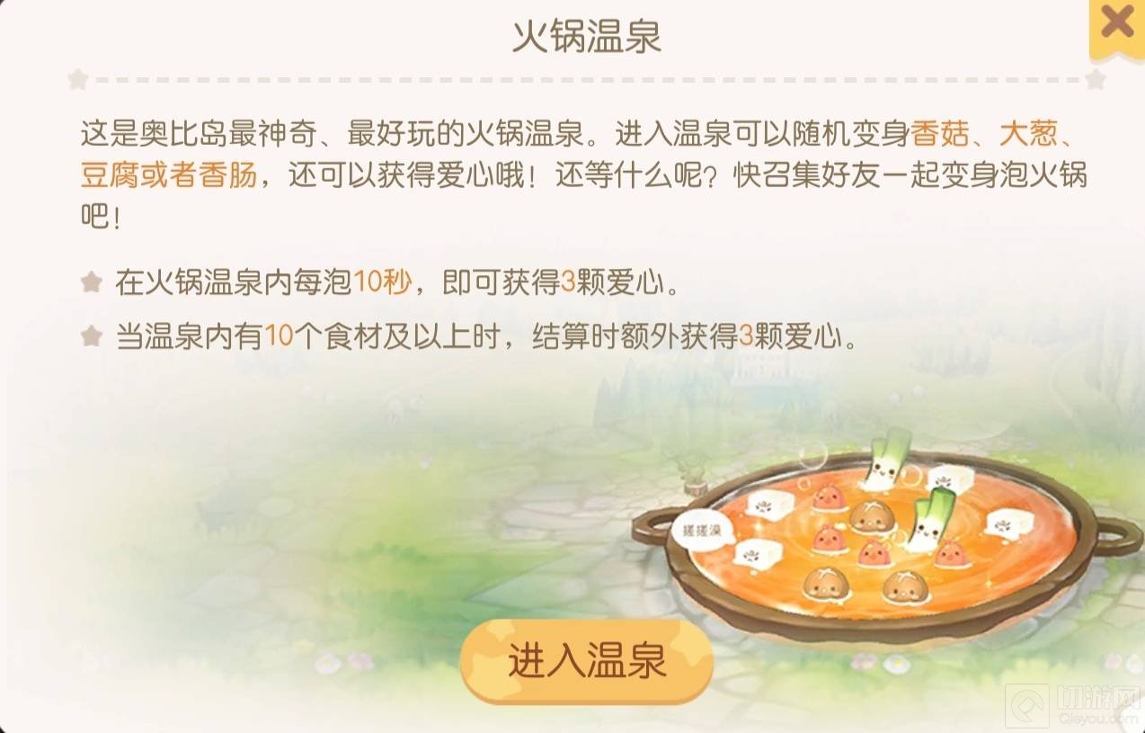 2. 还可以泡在火锅温泉中,每泡10秒获得3颗爱心,且不计入上面的爱心上限。