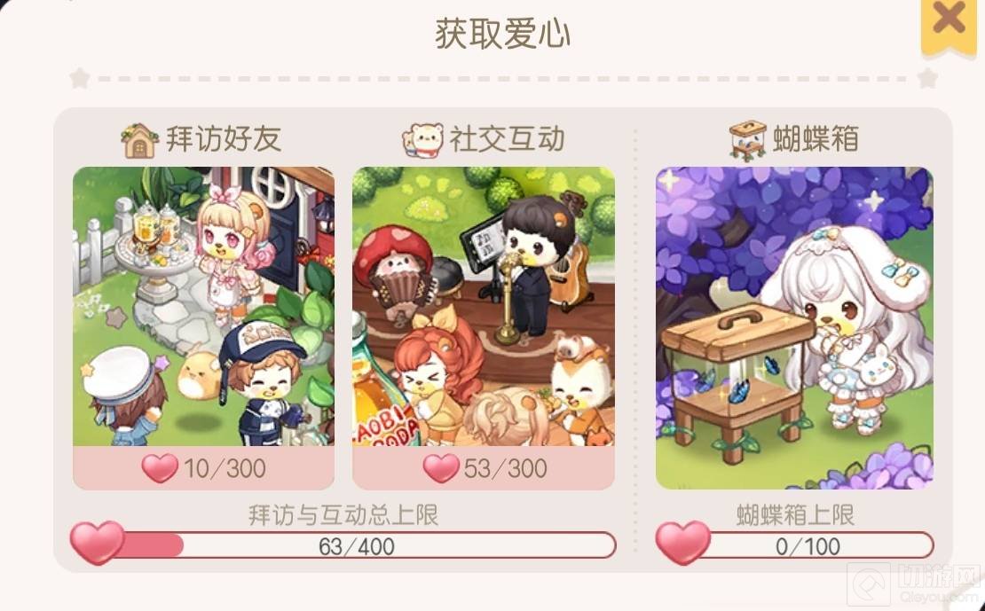 1.可以通过拜访好友和社交互动获得总上限为400的爱心,可以通过蝴蝶箱获得上限为100的爱心。