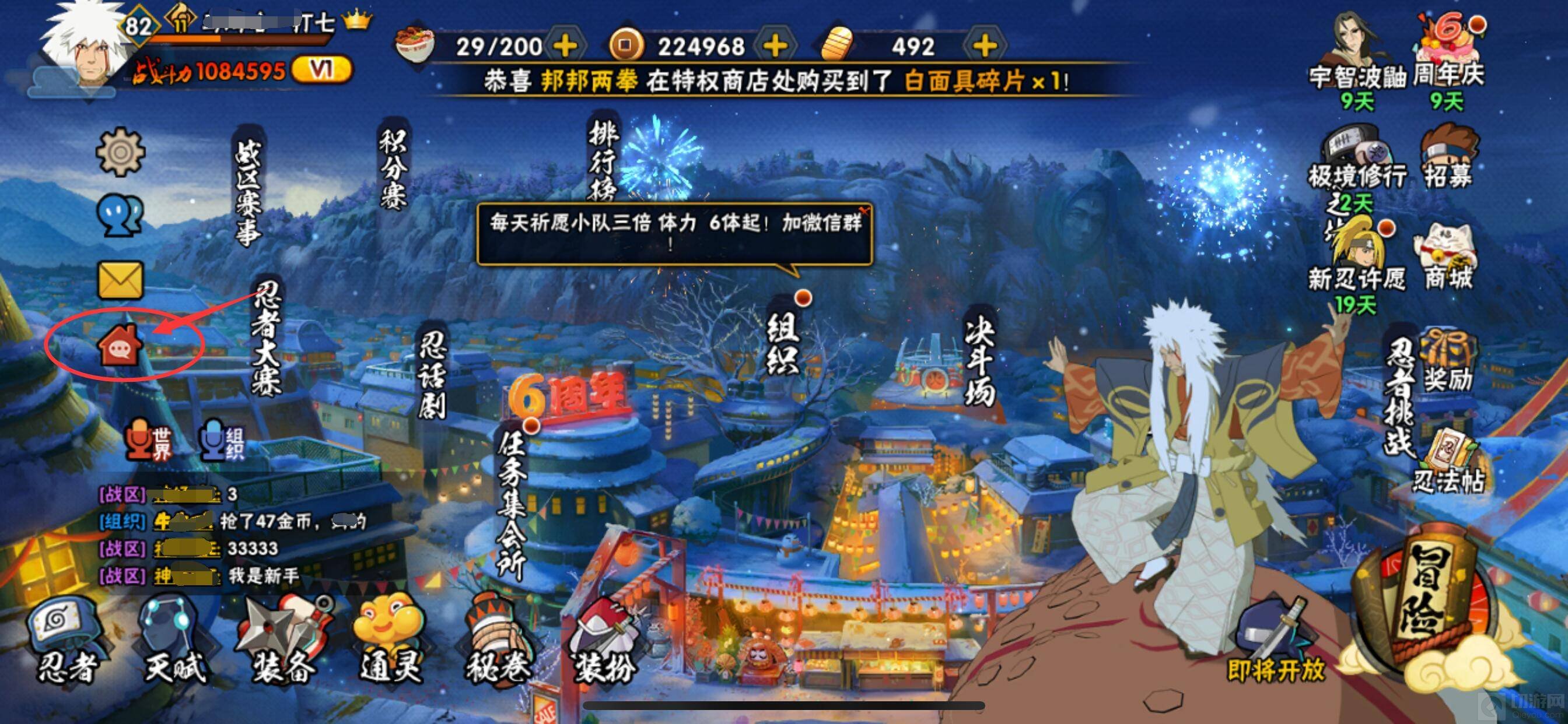 火影忍者手游口令页在哪?在游戏中有部分玩家对此还不太了解。接下来让为大家介绍一下吧。 火影忍者手游口令页位置: 1、在忍者站街的主页面中,找到左边中间这个红房子标志,从这个红房子可以进入到微社区页面。