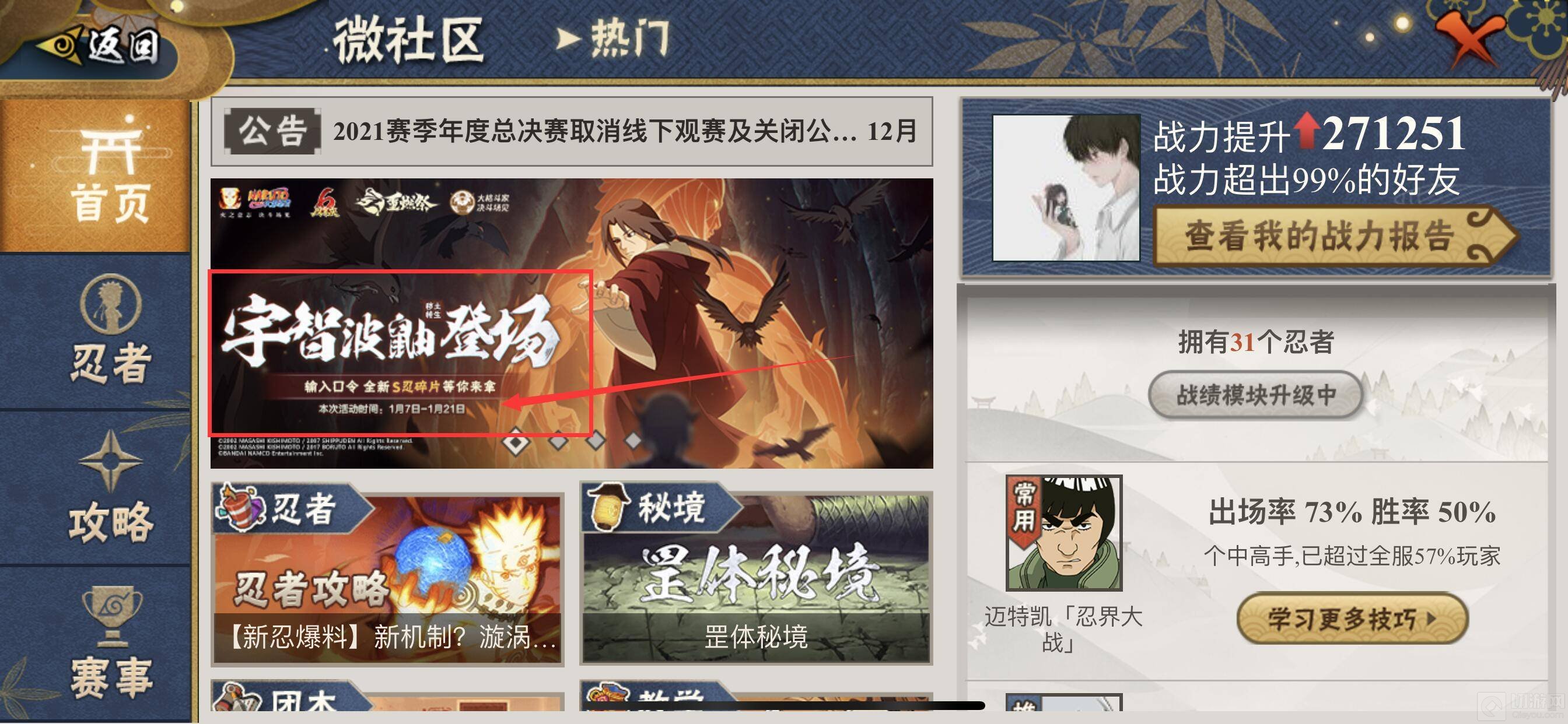 2、进到微社区首页时会有一个轮播的海报图,找到宇智波鼬登场这个海报图,是可以点进去的,点击进去即可。