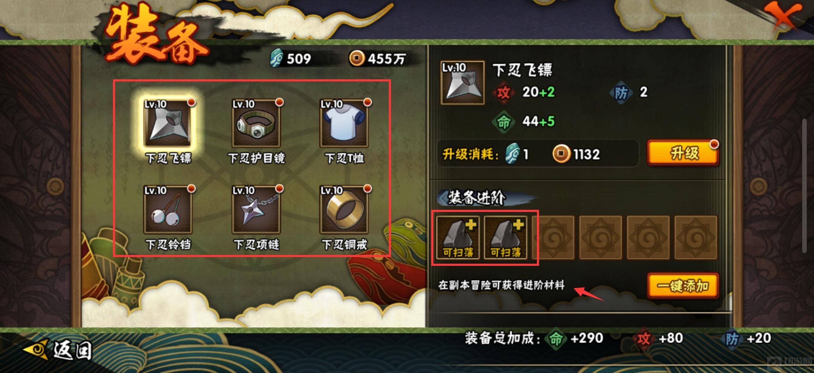 1、首先游戏主页面点击进入装备系统,一开始是白色下忍装备,在冒险副本中获取进阶材料,这里显示可扫荡,点击扫荡,获取材料就可以进行装备进阶,首先需要将白色进阶成绿色中忍装备。