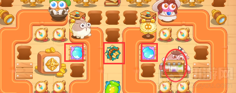3、基本上这一关卡还是要靠老虎机,可以多尝试几次,炮塔基本上就建立在红圈的位置。