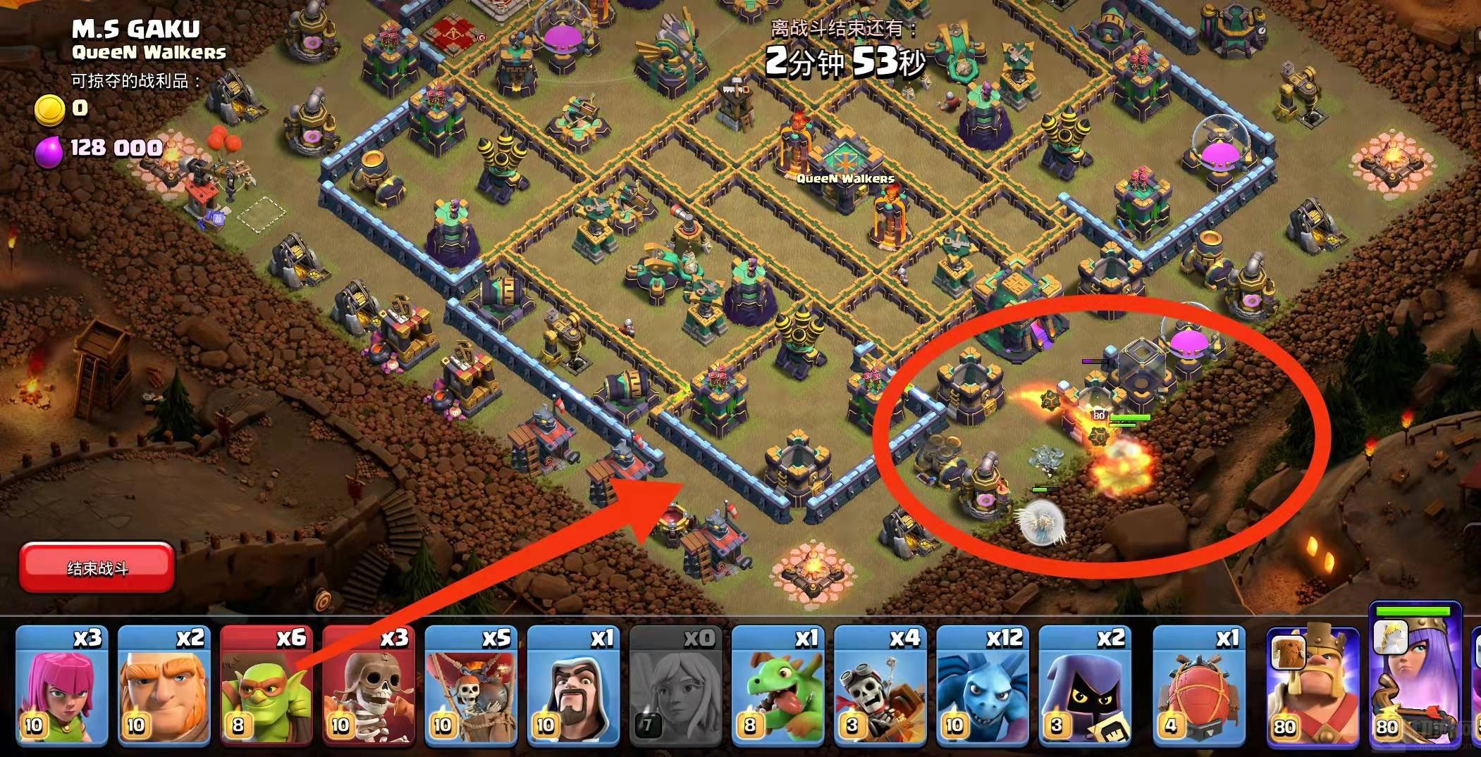 1、先进入全球总冠军挑战,然后从右下方放女王和超级哥布林清掉大本营和资源建筑。