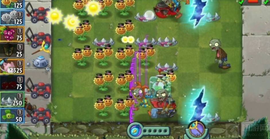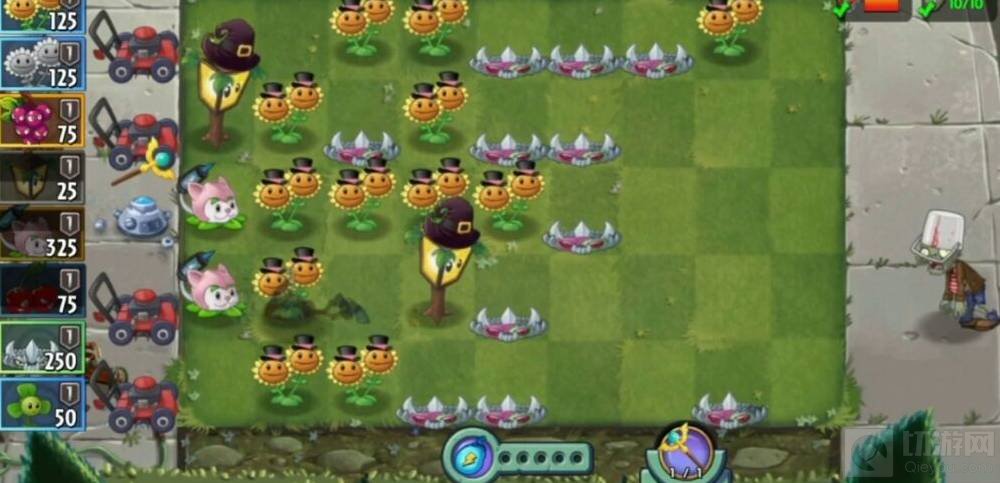 1、前期在前排放地刺,抵挡滚筒僵尸的进攻,后排先种向日葵,慢慢获得并积累阳光。