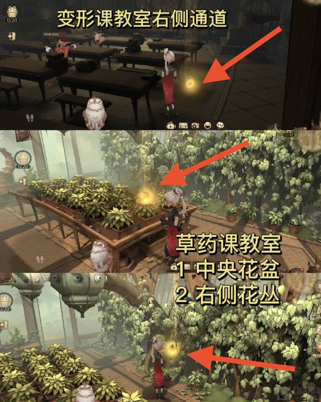 1、第一组闪闪发光的物品位置,第一个在变形课教室右侧的通道上,第二个在草药课教室中央花盆上,第三个在草药课教室右侧花丛中。