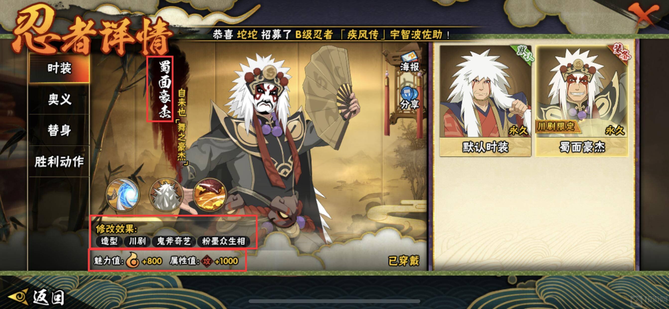 1、忍者时装是可以让该忍者在默认外貌下变换为时装的样子,相当于我们在游戏中的衣服与外貌变换。