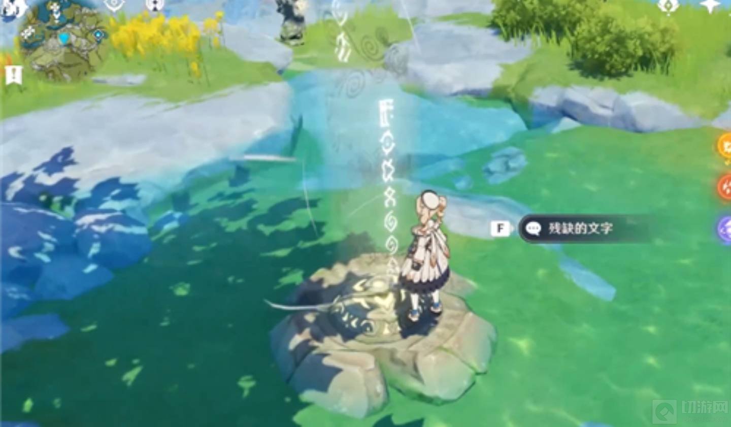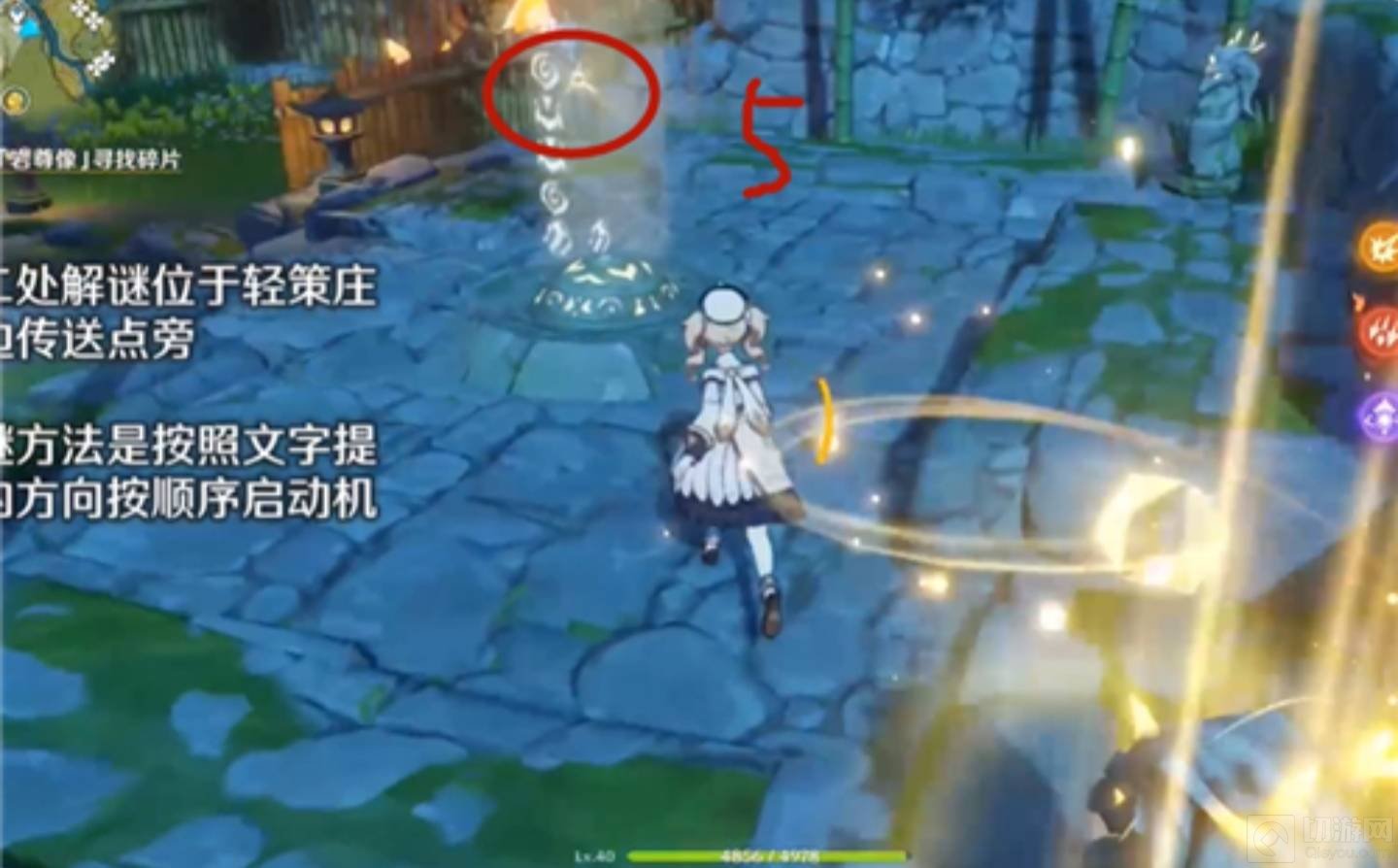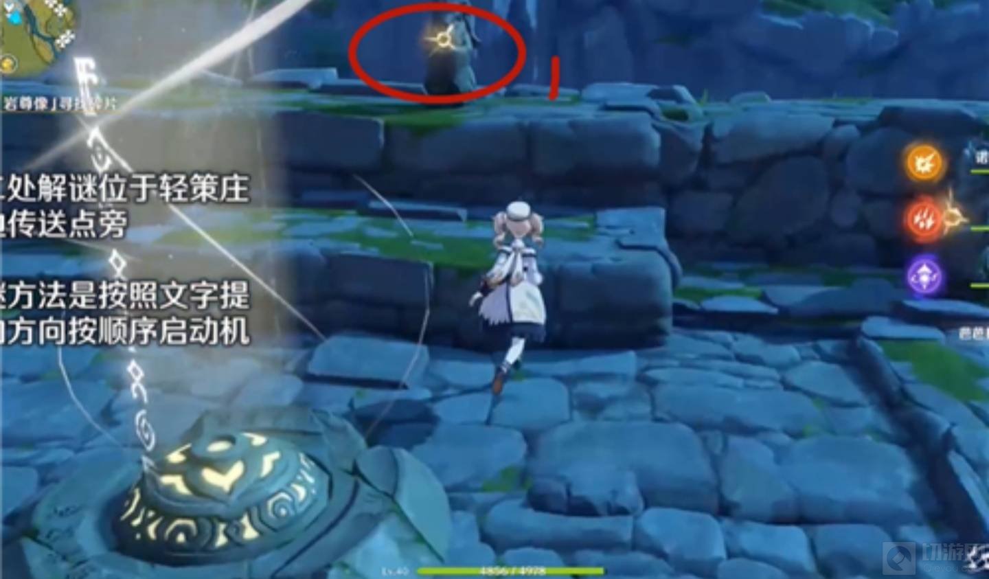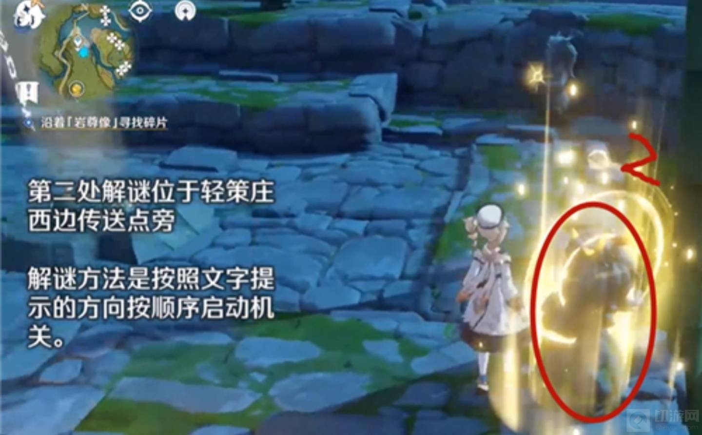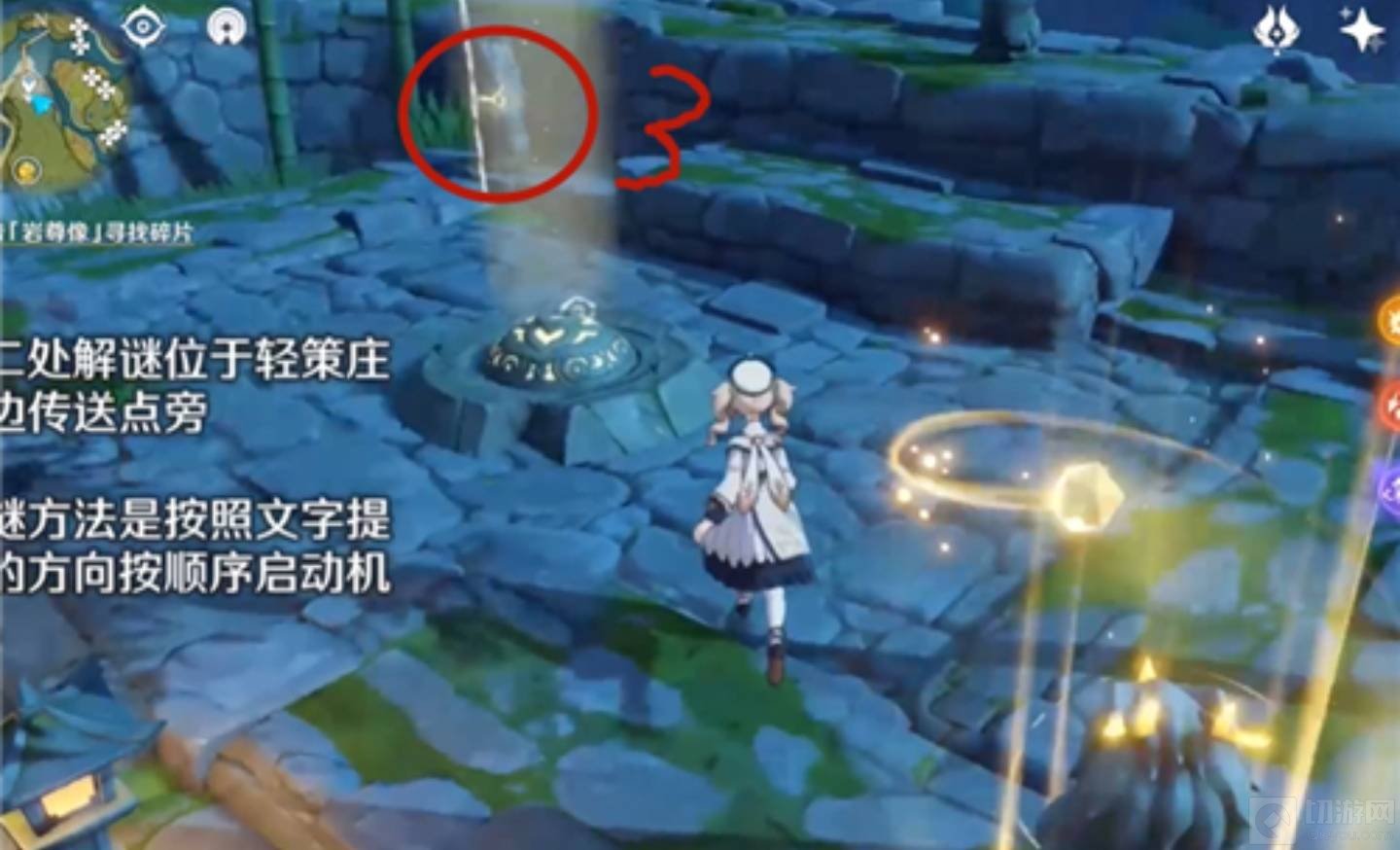 3、沿着岩尊像寻找碎片:第二处解谜位于轻策庄西边传送点旁,解谜方法是按照文字提示的方向,按顺序启动机关。