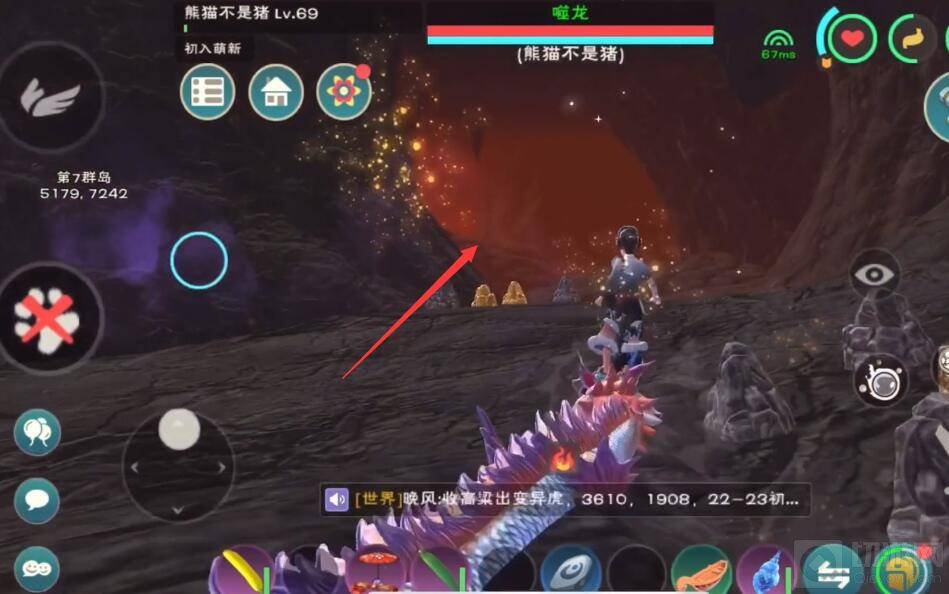 2、到达火山之后,围着地面绕一圈,仔细寻找前往熔岩之地的入口,入口的坐标是5188,7393,可以看到地面上是有一条小裂缝的,跳进去一直往里面走就可以了。