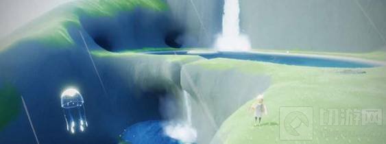 线索提示在瀑布右侧下方,点燃蜡烛之后壁画当中会显示编钟也在一个瀑布的下方。我们网瀑布下游走,会看到漂浮的发光水母,跳入洞内,就会看到一个小瀑布和瀑布旁的钟。