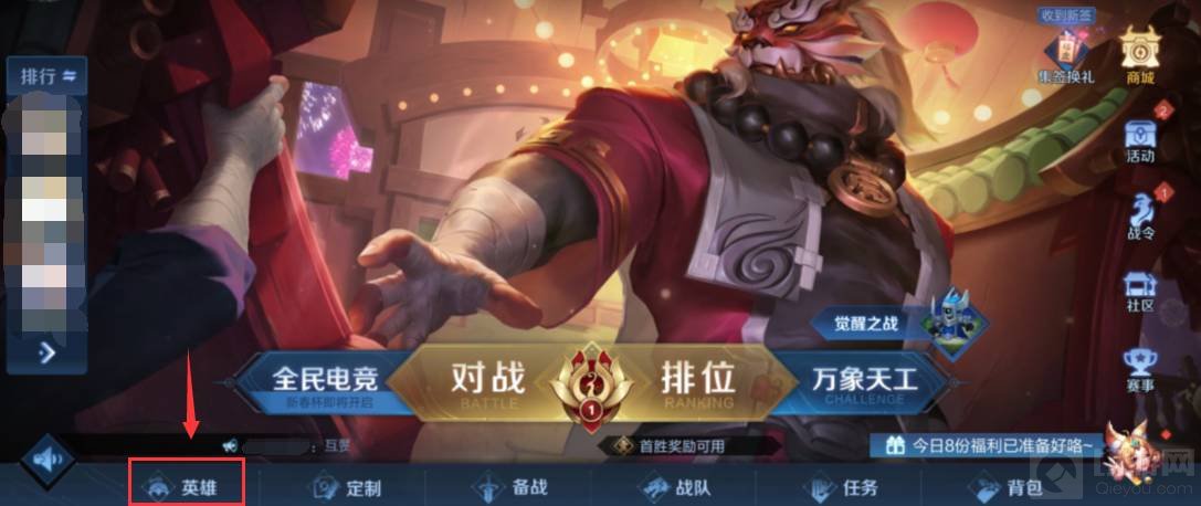 1.先王者荣耀,进入游戏主页面后,点击主界面下方的“英雄”。