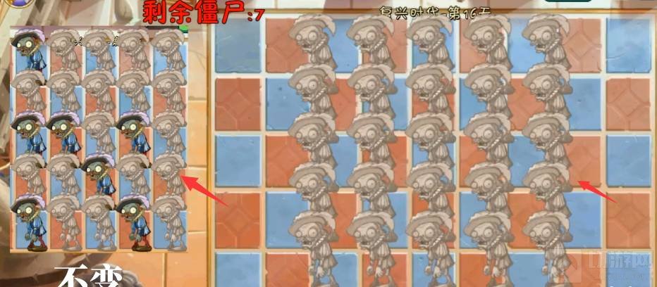 1、植物大战僵尸2中的复兴时代第16天过关流程:该关卡一共有十波,我们截图放在左边的是僵尸原本的位置,之后跟随图片的位置敲击僵尸就行了,下图是第一波。
