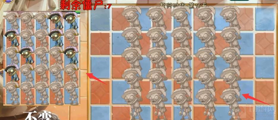 7、第七波照着左边僵尸的位置敲击。