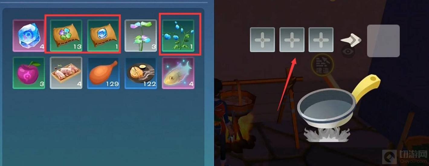 3.进入烹饪后,将四叶草,符文精华,天空果实放到右边的烹饪栏中。