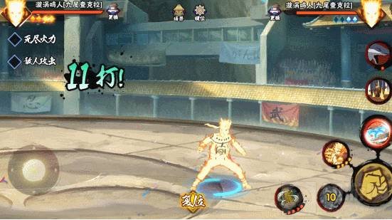 九尾鸣人的普攻拥有超强的机动性,使用查克拉手臂向前方进行攻击,命中敌人会造成平推硬直,接着拉手臂支撑地面,帮助该忍者跃向前方攻击对手。
