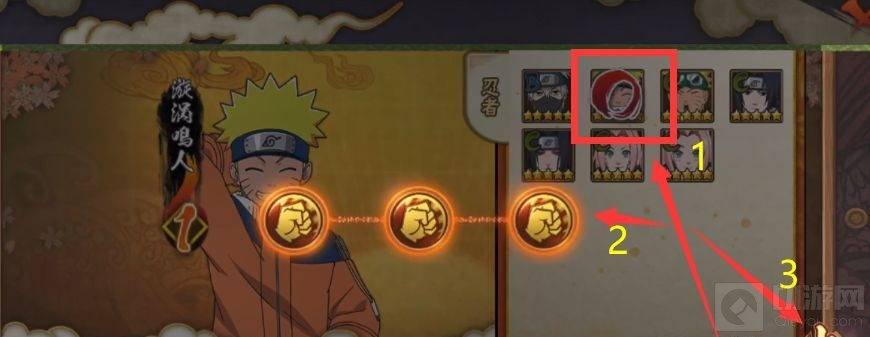 4、之后再点击漩涡鸣人,会跳出三个拳头,按下图的顺序点击出战。