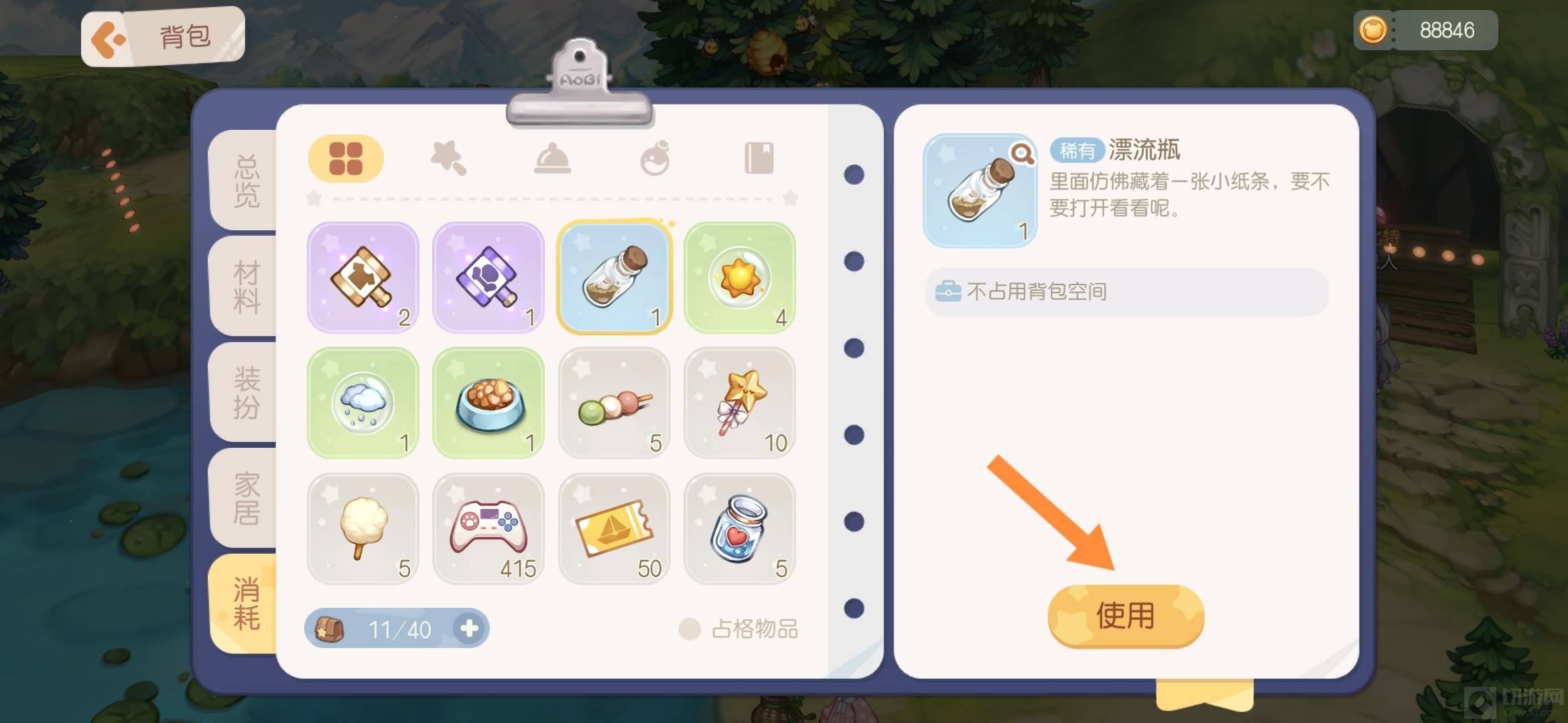 2.点击叮咚小溪旁边的苹果树,会掉落一个漂流瓶,点击背包。