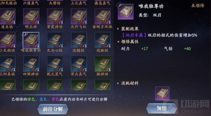 4、内功选择:月下断魂、神照经、纯阳无极功、唯我独尊功这些都是双刃的专属内功,红色、橙色品级的内功比较稀有,所以这里推荐带唯我独尊功,它可以为双刀的伤害增加5%,非常稳定。剩下的,带上《拈花指》提升命中率,长生诀增加对定身敌人的伤害,玄天指增加续航能力,清心诀提升防御力。内功可视伤害需要,根据实际情况更换。比如说追求“龙瘴”的持续性输出时,可以将长生诀换成四照神功持续减速敌人,拈花指换成炼筋诀,打出破防输出。