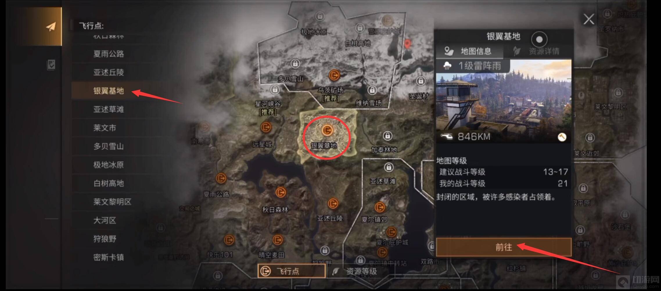 1、先前往飞机旁打开传送点地图,选择前往银翼基地。