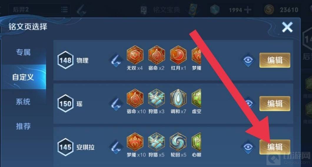 4、然后点击右边的编辑,即可开始编辑自定义铭文。