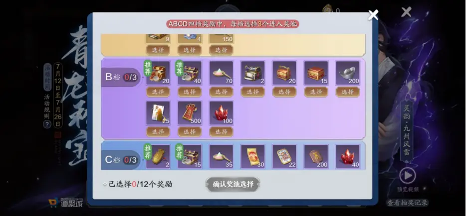 天四和玄河·焕生自选礼不用多说,在C档必选,最后一个位置留给天衣礼券或幻彩之纱,这里看个人选择。其他的道具都可以白嫖获取,可以不需要在此进行选择。