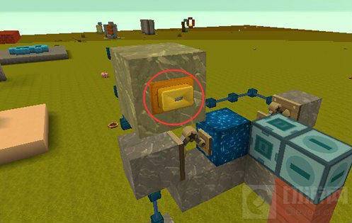 4.在滑动方块的后方往下一格的位置放上横着的四个岩石,这个是用来放机械臂和电石块的,控制滑动方块的通电情况; 注意:四个岩石不能和滑动方块放在同一水平上,要往下一格。