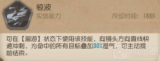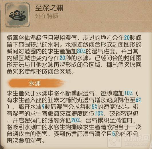 1、技能解析:外在特质-至深之渊,当求生者湿气值叠加到100%时会受伤,并获得受击加速效果。