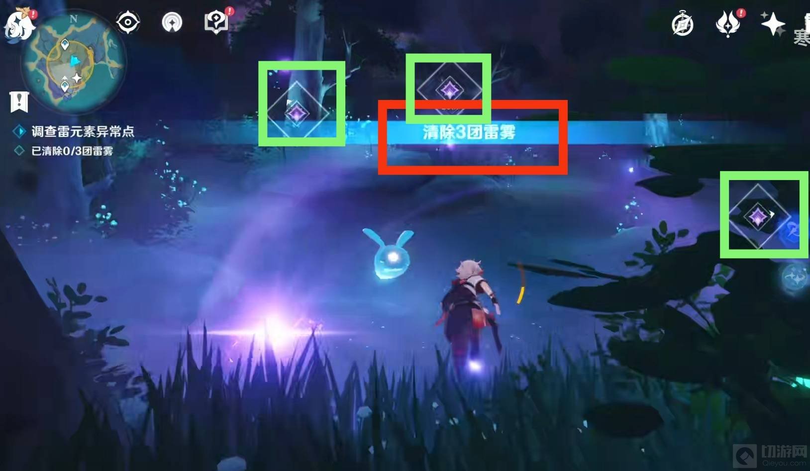 2.靠近后会提示要清除3团雷雾,并会显示这三处位置。