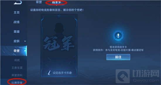 在获得选手卡后,进入到个人页面然后找到荣誉按钮,点开后会发现下面有一个比赛荣誉按钮点击进去即可。