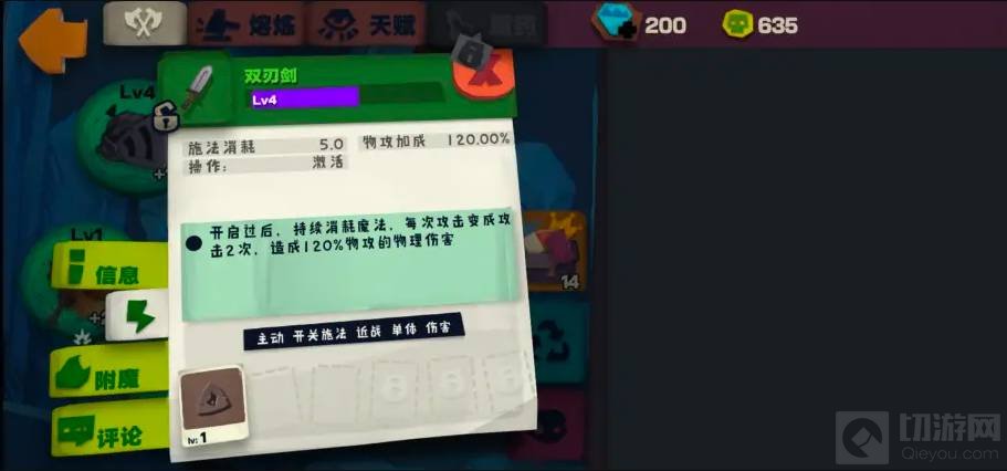 1、技能:开启后,持续消耗魔法,每次攻击会变成快速攻击两次,造成120%的物攻的物理伤害,附魔后会变成快速攻击三次。
