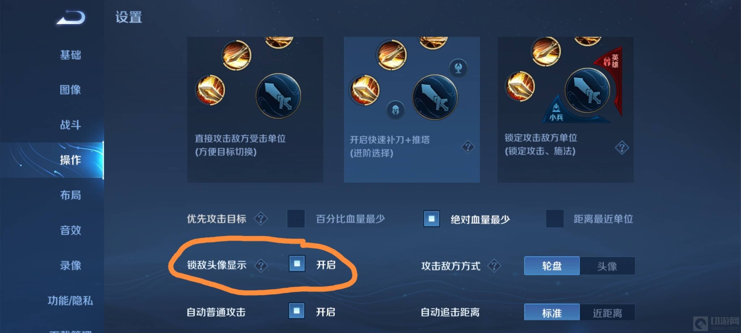 5、还可在锁敌头像显示中选择“显示可攻击头像”,在游戏过程中就可以点击目标英雄头像进行攻击了。