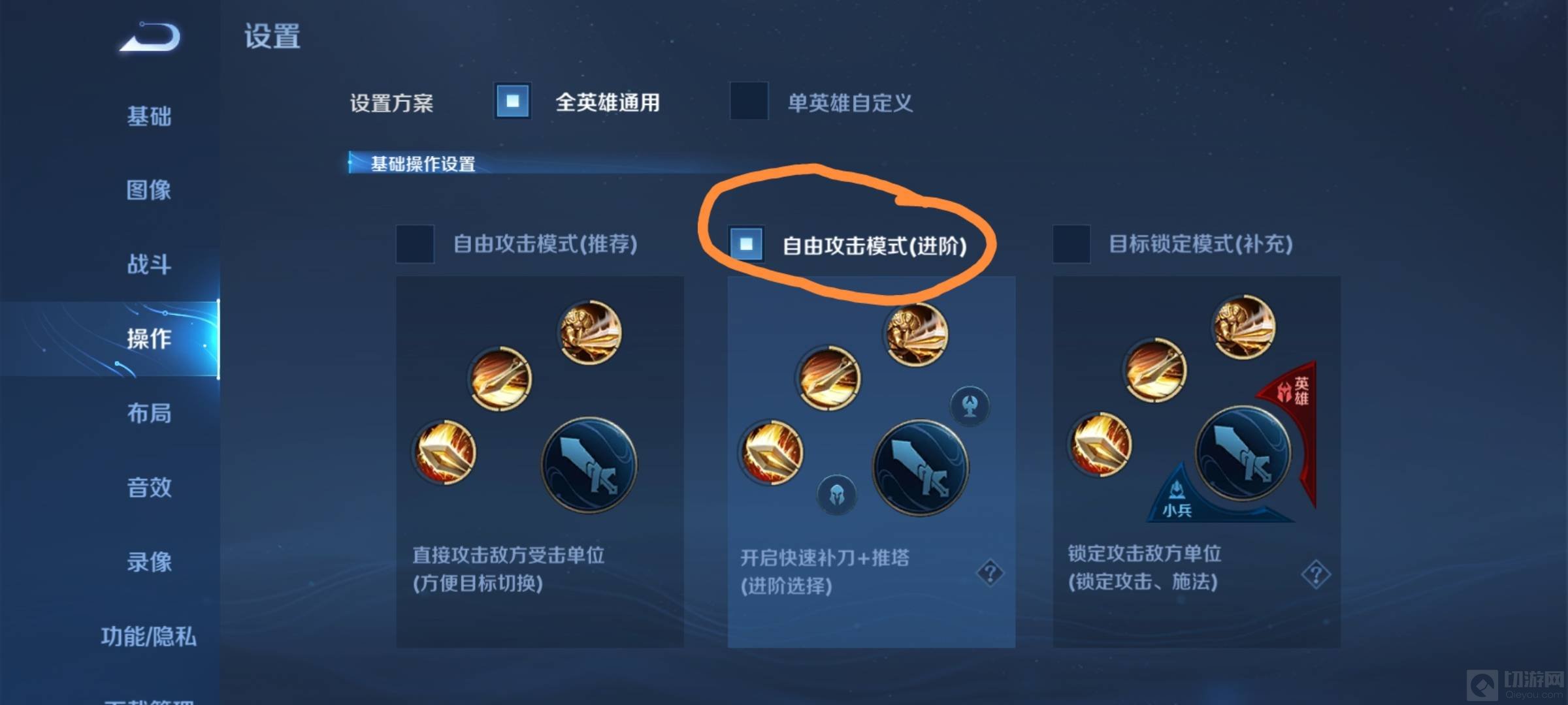 3、在基础操作设置中选择“自由攻击模式进阶”。