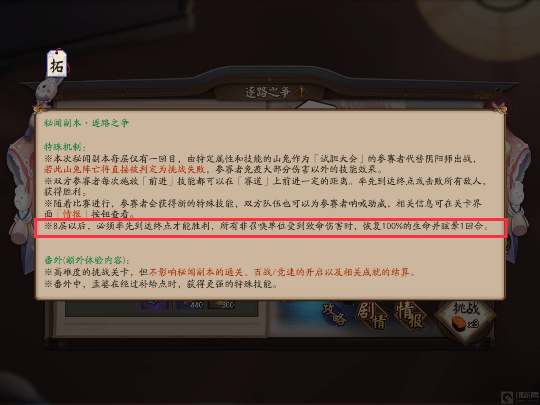 孟婆秘闻第9层必须率先到达终点才能胜利,阵容上选择不知火、酒吞童子、云外镜、千姬、缘结神,主要是多打胡萝卜,让孟婆多点眩晕,山兔就能跑得越快。开局自动标记对面的孟婆,打掉孟婆的血条会获得胡萝卜,然后用缘结神等不需要输出和使用技能的式神去打孟婆,获得三个胡萝卜让山兔前进一格,被打掉一条生命的孟婆会陷入眩晕不会使用技能跑起来。我方保护好山兔,跑到终点就胜利了。