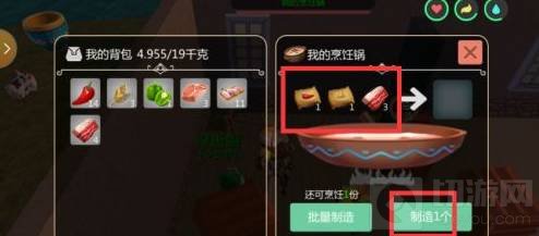 4、点击烹饪锅后会进入到烹饪的系统界面。选择分别添加小麦饲料包加辣椒饲料包再加上优质肉这几种材料,最后点击制造1个按钮,有多余材料的小伙伴也可以选择批量制作,此时红马饲料就制作完毕啦。