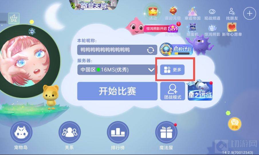 球球大作战技战室在哪?在游戏中有部分玩家对此还不太了解,接下来让为大家介绍一下吧。 球球大作战技战室位置如下: 1、首先进入球球大作战主页,找到更多然后点开,如下图。 2、点开更多后,左上角就可以找到