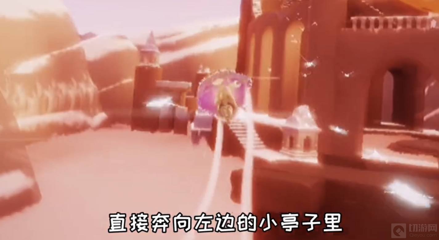 3、进入霞光城之后视角转向左边,有一个亭子,飞向那里。