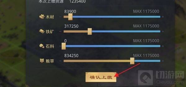 4.于是,我们调整我们的资源,将我们的木材、铁矿、石料、粮草上缴的资源调整为1235400。这里,建议上缴的资源以粮食为主。如下图所示。