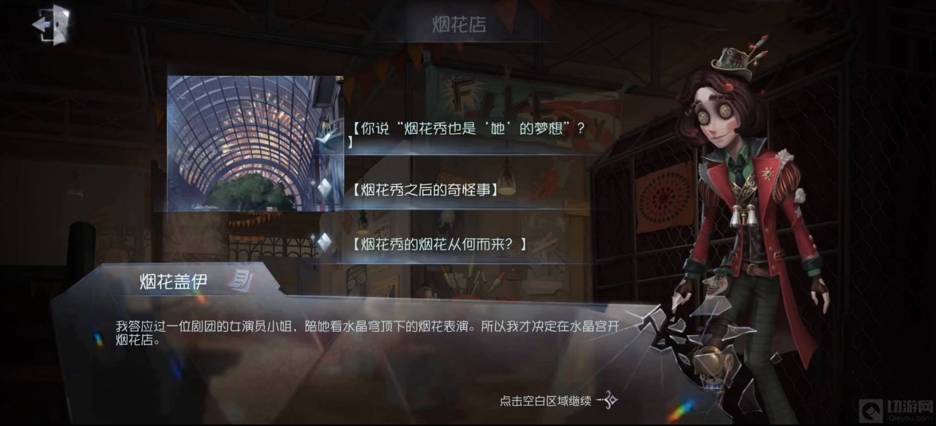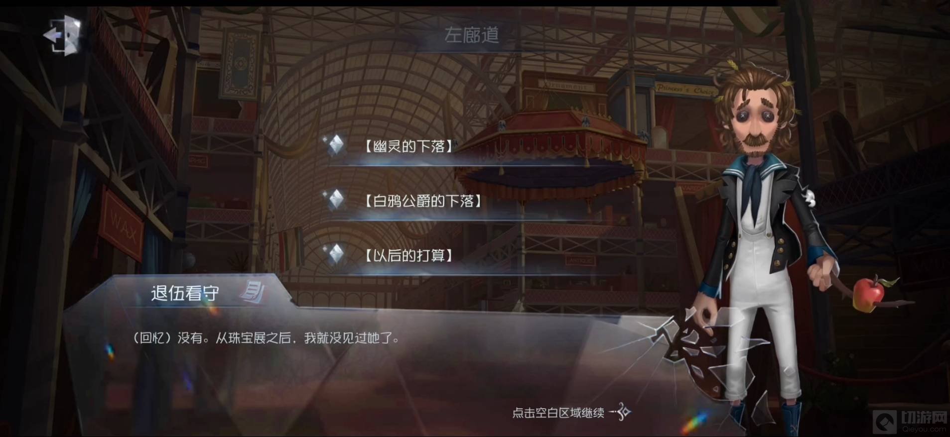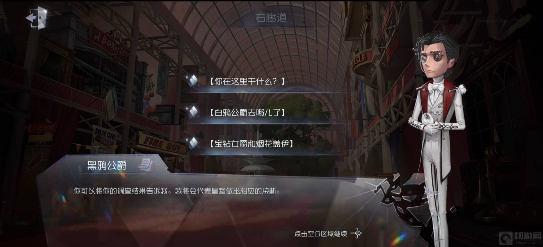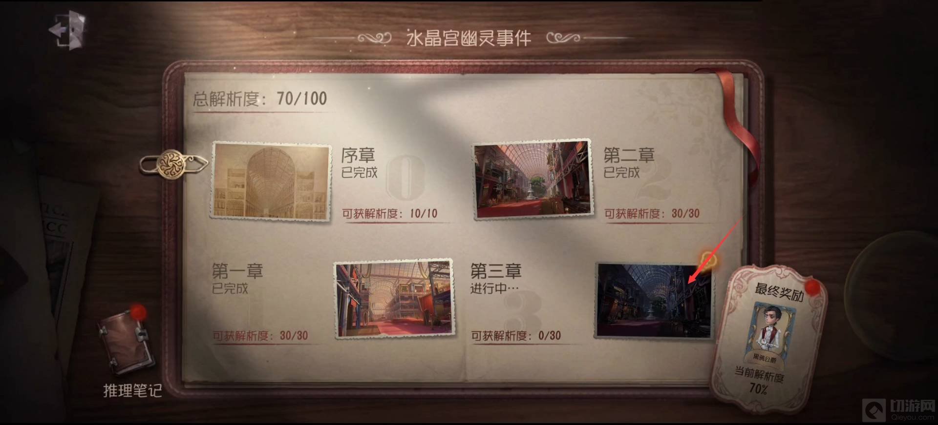 1、完成前面两章,进入第五人格水晶宫第三章剧情: