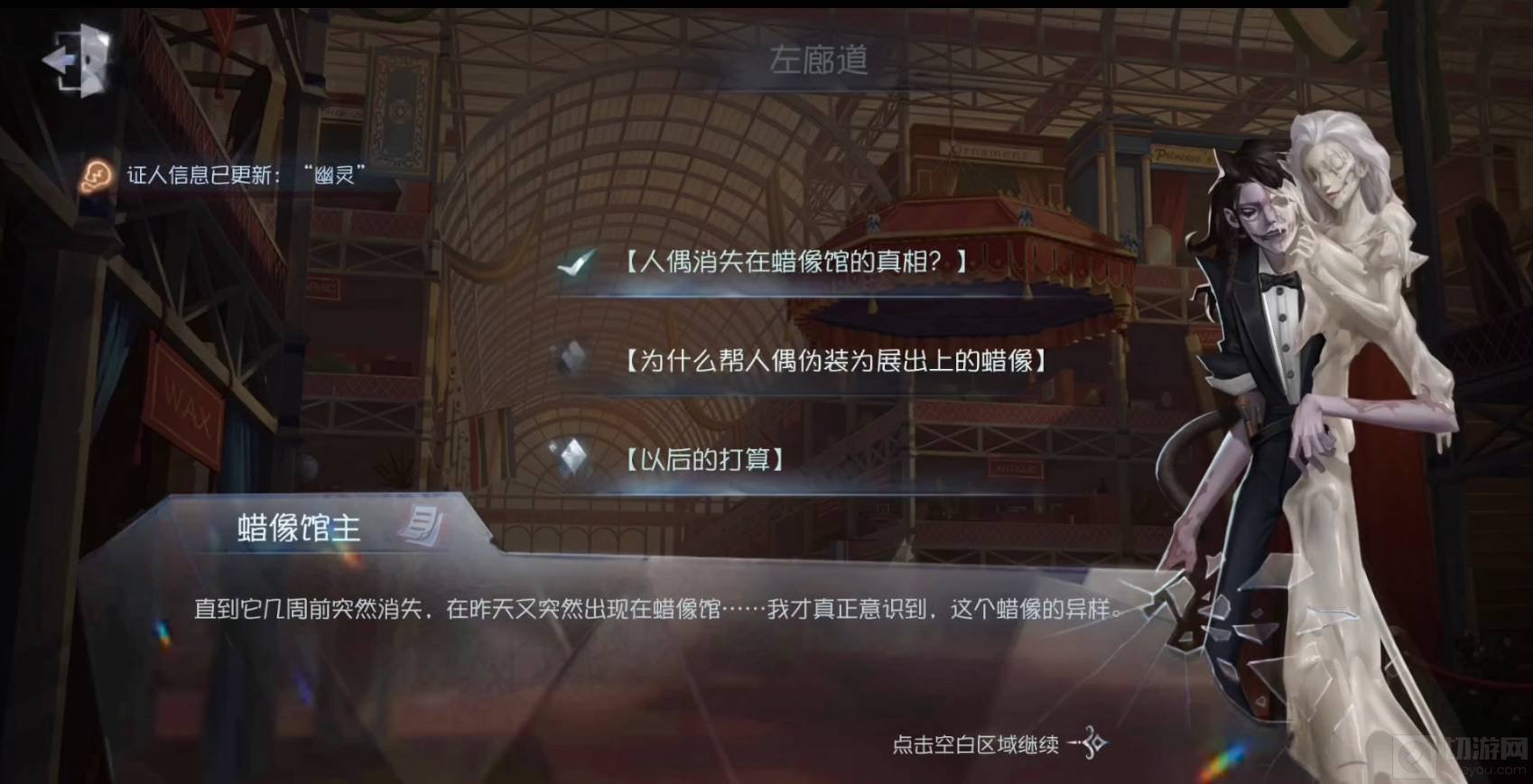 2、首先,我们和蜡像师先生队形剧情对话,更新证物信息:展出蜡像,”幽灵“,蜡像师。