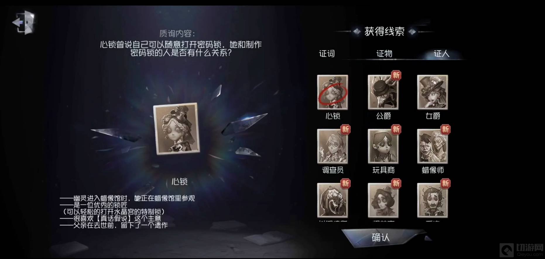 3、质疑线索这里选人物”心锁“,然后更新证物信息:心锁,
