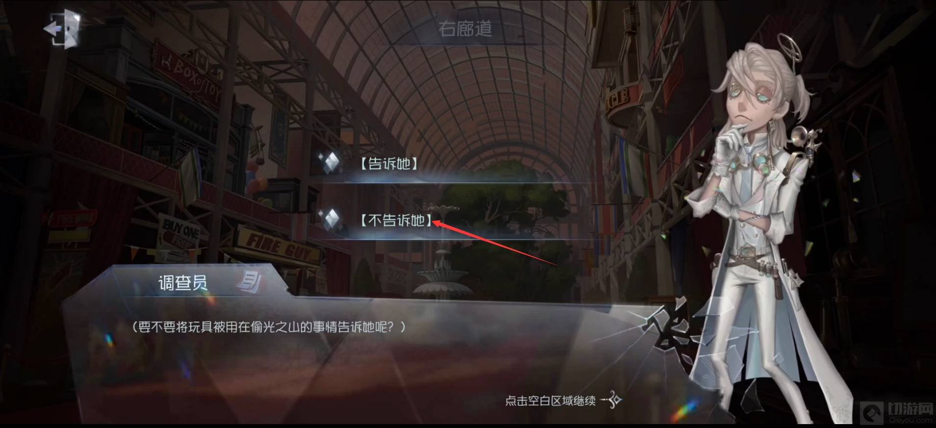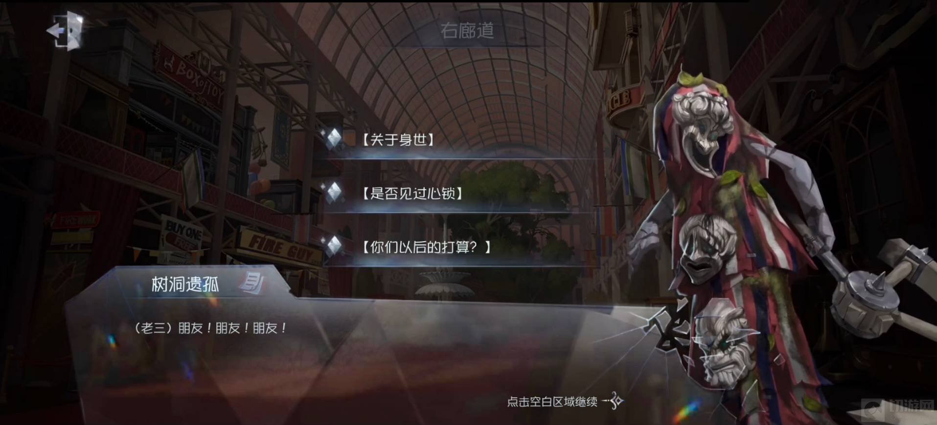 5、我们回到右廊道,和树洞遗孤进行剧情对话,更新证物信息:调查员,心锁,