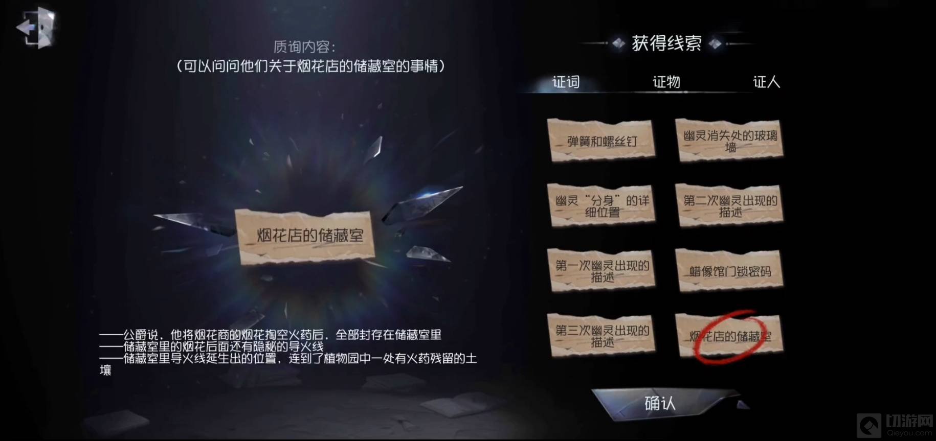 6、质疑线索这里选证词”烟花店的储藏室“,更新证物信息:烟花店的储藏室,