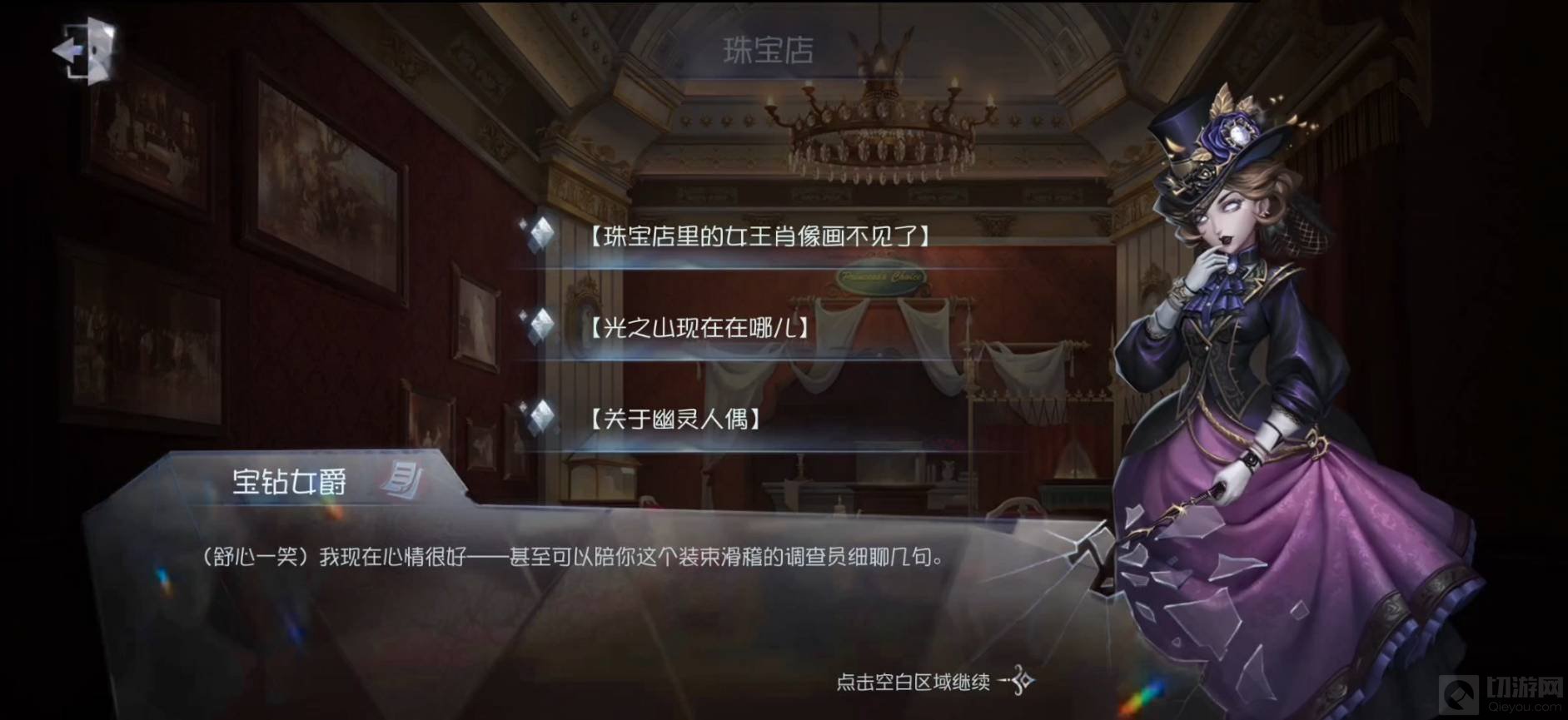 11、然后,我们回到左廊道,推进剧情,之后,我们来到珠宝店,和宝钻女爵推进剧情,更新证物信息:女王肖像画,镜子和三棱镜,”幽灵“,