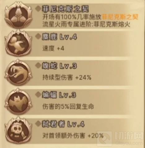3、天赋搭配:蝙蝠(伤害5%回复生命),弑君者(对首领额外伤害&对召唤物额外伤害),蝮蛇(持续性伤害 24%),麋鹿(速度&速度差额外伤害)。